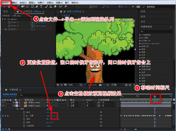 同样的,移动时间标尺,更改位置数值,使大树的牙齿在嘴巴张开的时候张开,在嘴巴闭上的时候上,实现大树说话的动画,然后点击键盘空格键预览视频,预览无误点击【文件】—>【导出】—>【添加到渲染队列】。
